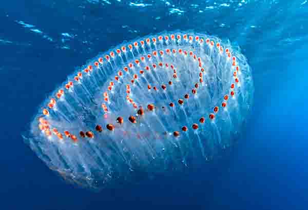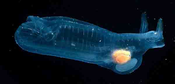 サルパは海中でダイビング中に目撃されたり、浜辺に大量に打ち上げられる事もあります。タル型で寒天のような体に水を通し、ジェット推進で移動します。この時、吸引した海水を体内のフィルターでろ過して植物プランクトンを捕食します。体長は2~5cmの個体が多いですが20cm程度になるオオサルパもいます。海洋実習の時サルパをかじったことがありますが、苦い思い出です。